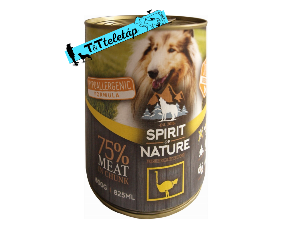 Spirit Of Nature Hypoallergén gabonamentes konzerv felnőtt kutyák számára struccal , speciális összetételű gyógynövényekkel, gyümölcsökkel.
